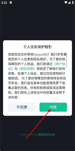 1、在個人信息保護指引彈窗中點擊同意按鈕,進入應用引導頁面。