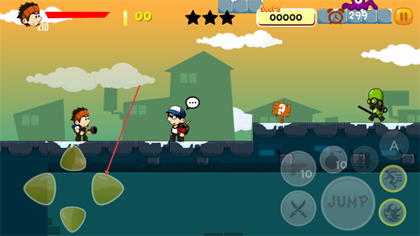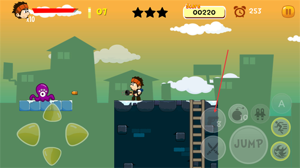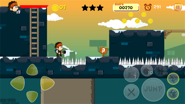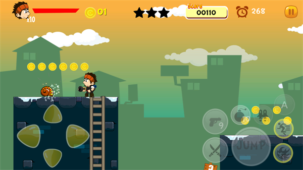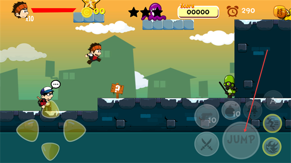 3、點(diǎn)擊JUMP讓角色跳躍至上方平臺(tái)收集金幣,同時(shí)需避開敵人防止受傷,以此提升關(guān)卡得分推進(jìn)游戲的進(jìn)程。