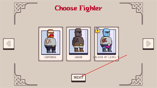 1、在ChooseFighter界面選擇可用角色,選定后點擊NEXT按鈕,即可進入游戲的后續(xù)環(huán)節(jié)。