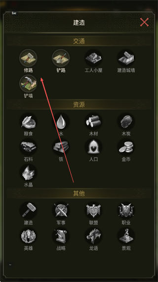 2、點擊右側(cè)建筑按鈕,打開建造界面,選擇交通分類下的修路選項。