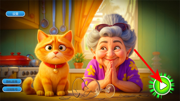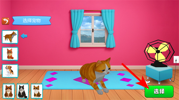 2、游戲中依照紅色箭頭指引,在寵物選擇界面點擊選擇按鈕,確認當(dāng)前寵物如橘貓并進入游戲場景,完成初始設(shè)置。