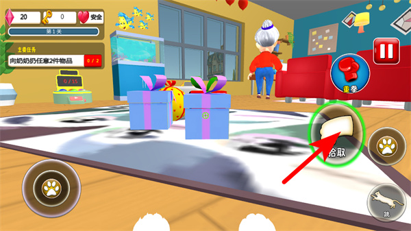 3、緊跟紅色箭頭指引,點擊拾取按鈕獲取場景中的物品如紙巾,收集任務(wù)所需道具,推進主線任務(wù)進度。