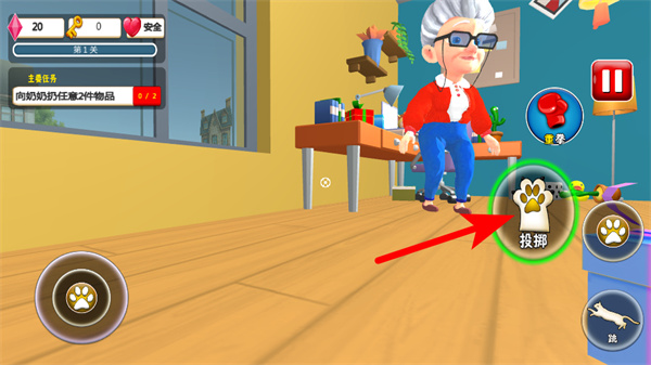 4、收集道具后,跟隨紅色箭頭提示,點擊投擲按鈕將物品丟給目標(biāo)角色,完成物品交付的任務(wù)要求,達成關(guān)卡目標(biāo)。