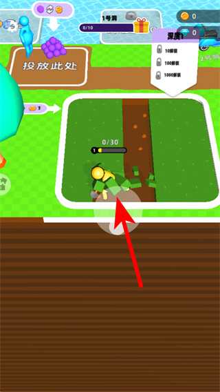 1、進(jìn)入游戲后,依照紅色箭頭指引,將角色投放到1號洞的投放此處區(qū)域,啟動角色的挖掘流程,這是開啟操作。