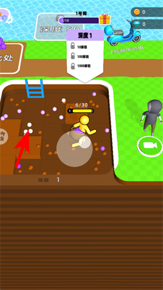 2、游戲中緊跟紅色箭頭指引,操作角色向下挖掘泥土,推進(jìn)洞穴的深度進(jìn)度,同時(shí)收集挖掘過程中出現(xiàn)的資源。