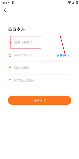 2、在重置密碼頁面輸入手機(jī)號后,點(diǎn)擊獲取驗(yàn)證碼按鈕獲取驗(yàn)證碼。
