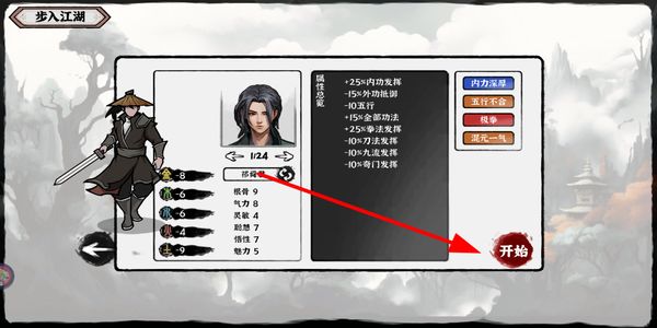 3、完成角色屬性與詞條的設(shè)置后,點(diǎn)擊開(kāi)始按鈕,正式開(kāi)啟在武義九州世界中的冒險(xiǎn)旅程。