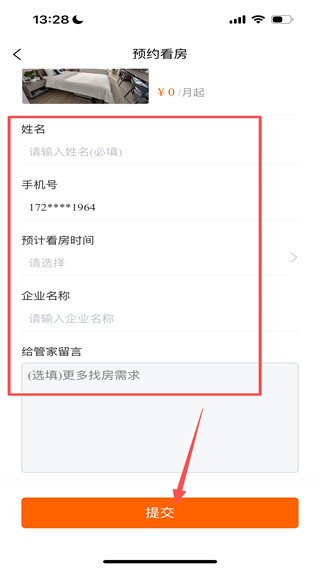 4、在預(yù)約頁(yè)面,填寫信息后,點(diǎn)擊提交按鈕即可完成看房預(yù)約。