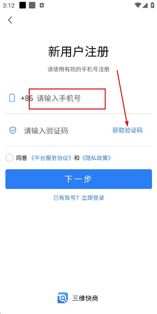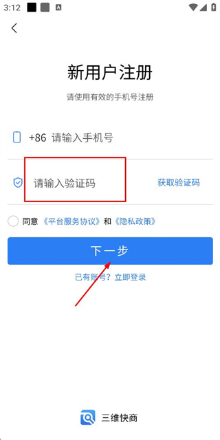 3、在注冊賬號頁面填寫驗(yàn)證碼,勾選協(xié)議后點(diǎn)擊下一步完成注冊操作。