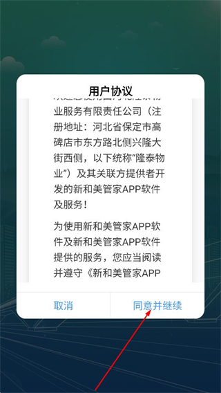 1、閱讀新和美管家用戶協(xié)議后,點擊同意并繼續(xù),進入登錄頁面。