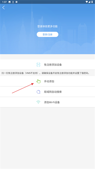 3、在添加設(shè)備的頁(yè)面內(nèi),點(diǎn)擊手動(dòng)添加的按鈕。